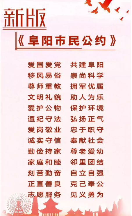 为培育和践行社会主义核心价值观,推动提升城市道德内涵和文明程度,近日,阜阳市文明办在广泛征集市民意见的基础上,新修订了《阜阳市民公约》。新版《阜阳市民公约》以社会主义核心价值观公民个人层面的价值准则为